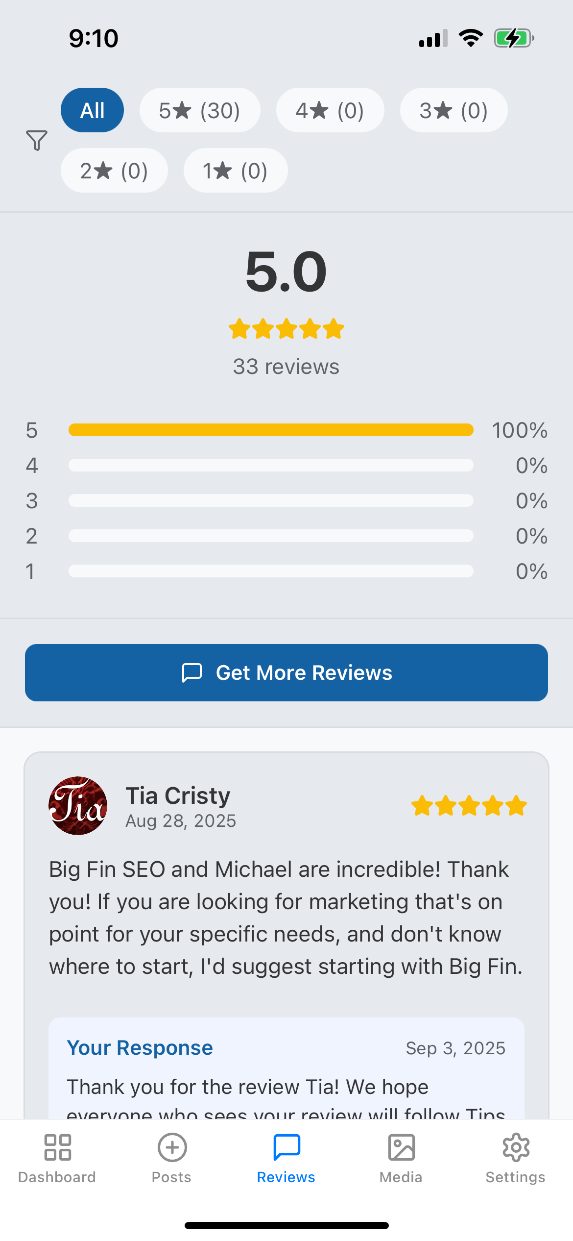 Local visibility shouldn’t depend on finding time you don’t have. Big Fin Local automates the high‑impact tasks that move rankings and revenue so your business stays active, accurate, and appealing in local search, without extra effort.